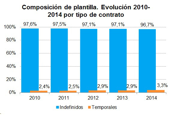 El sector asegurador registra una de las tasas de trabajo temporal más bajas entre los diferentes sectores económicos de España, con un 96,7% del personal en plantilla de las aseguradoras con contrato fijo en 2014. ICEA precisa que la tasa de temporalidad es una de las más bajas entre los diferentes sectores económicos, cuya tasa se situó en el 24% de contratos temporales, más de siete veces mayor que en seguros.
