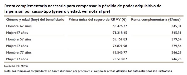 Ante este escenario, ya de todos conocido, el ahorro complementario gana cada día terreno. En este sentido, las rentas vitalicias se perfilan como el instrumento idóneo "para complementar la pensión pública de jubilación ya que alivian las presiones que existen sobre el sistema público de pensiones y contribuyen a la sostenibilidad" afirmó José Antonio Herce, profesor de AFI Escuela de Finanzas y codirector del estudio 'Soluciones para la jubilación. Naturaleza, ventajas, defensa y fomento de las rentas vitalicias en España' realizado a instancia de Unespa. "Este es el estudio que estábamos desando hacer", señaló al comienzo de su exposición. Y es que, a la vista de los datos ofrecidos, AFI estima que una persona que se jubile hoy con 65 años, comprando renta vitalicia por valor de unos 63.000 euros obtendría una renta de por vida de 350 euros al mes, suficiente para compensar esa pérdida de poder adquisitivo estimada.