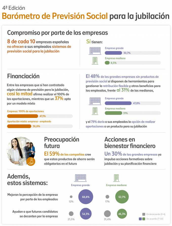 Por otro lado, aunque el 48% de las grandes empresas sin productos de previsión social sí cuenta con herramientas de retribución flexible, solo el 31% de las medianas dispone de ellas. Sin embargo, en ambos casos, la mayoría estaría dispuesta a permitir que sus empleados destinaran parte de su salario a productos de ahorro para la jubilación.