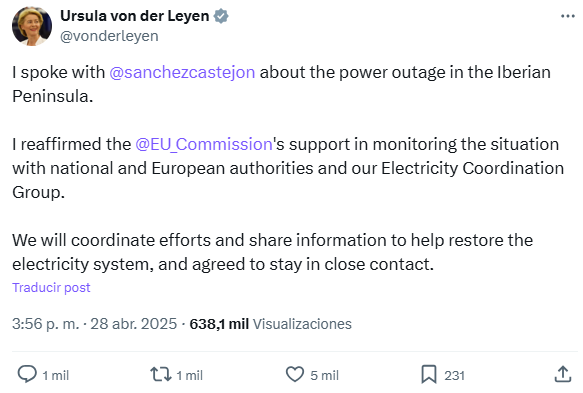A las 15 horas, se reunía por primera vez el Consejo de Seguridad Nacional en La Moncloa. En ese intervalo, la Comisión Europea afirmaba que estaba en constante comunicación con los tres países afectados. Y sobre esa hora, el norte peninsular empezaba a recuperar poco a poco la electricidad, especialmente el País Vasco. Y sobre las 16 horas, se conocía que también Salamanca. ¿La razón? Gracias a la interconexión con los países limítrofes.