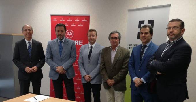 El acuerdo sellado en la sede de la dirección territorial de aseguradora lo firmaron Genaro Sánchez Capilla, residente del Colegio, y Jose María Alonso de Lomas Romero, director territorial de Mapfre en Granada y Almería; ante la presencia de Ángel Vida-Frontaura, director de desarrollo de negocio del Canal de Corredores, y Jose Miguel Moreno Cano, director de oficina; por parte del Colegio Enrique J. Perez Aguilera, vicepresidente y Juan Bautista Meseguer Flores, vocal de Formación.