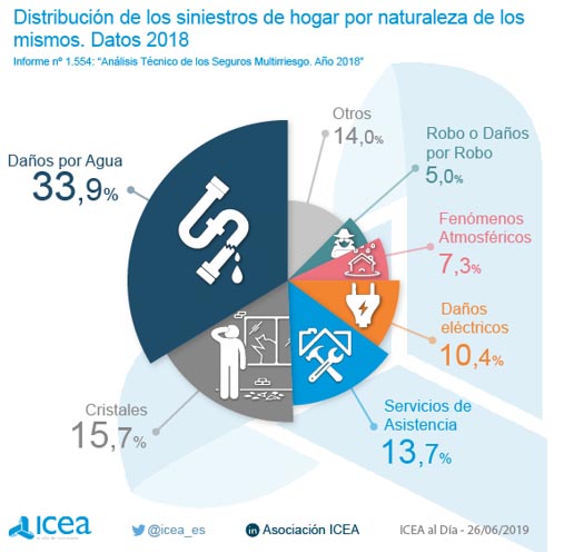 El 33,9% de los siniestros que se produjeron en los hogares españoles durante 2018 tuvieron a los daños por agua como protagonista principal, según los datos de ICEA. Esta cifra dobla a los daños por cristales que ocuparon el 15,7% de los siniestros que ocurrieron en los hogares asegurados, seguido de los servicios de asistencia (13,7%) y los daños eléctricos (10,4%).