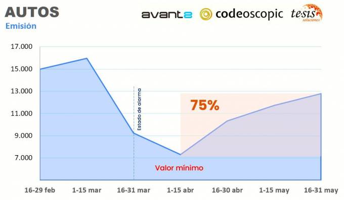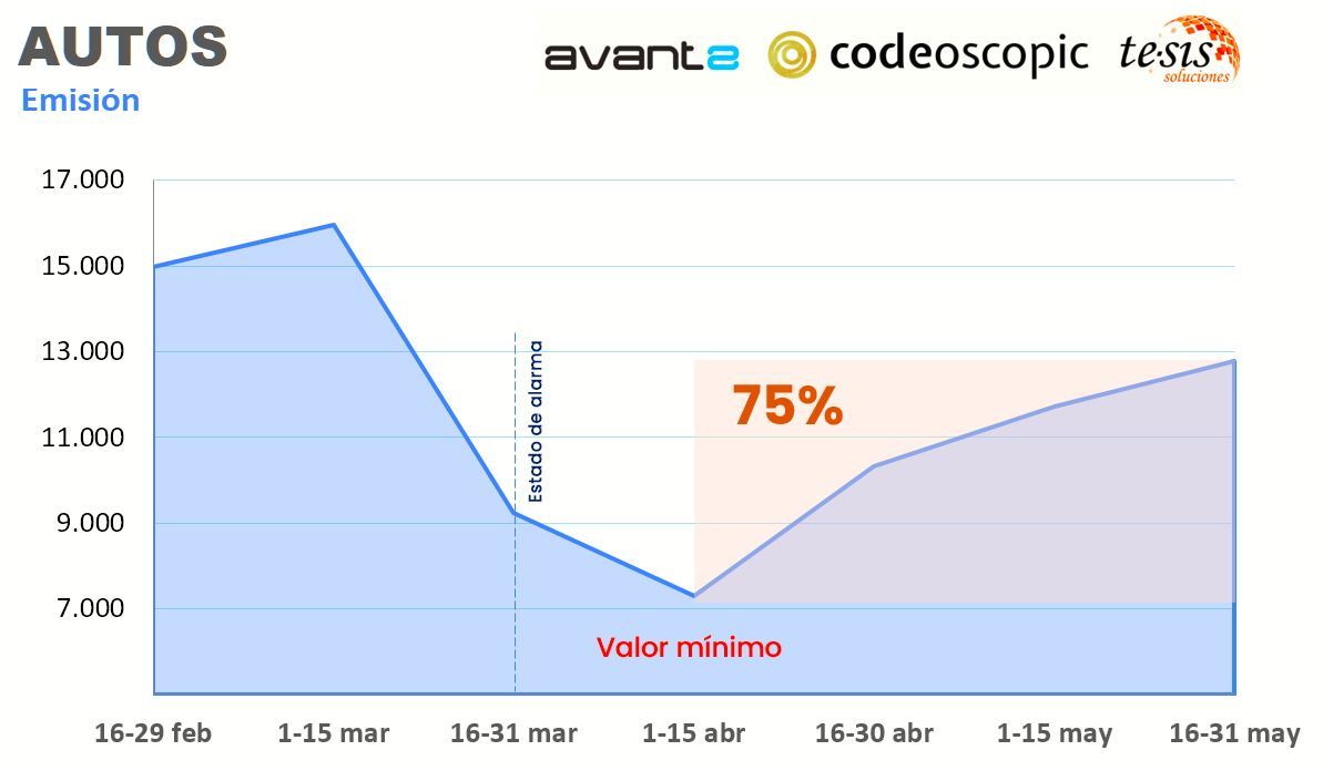 La emisión de pólizas de Autos ha sido muy positiva durante el mes de mayo, hasta alcanzar un incremento del 75% con respecto al punto más bajo de producción registrado en la primera quincena de abril, coincidiendo con la Semana Santa. Estas son las cifras que arroja Avant2 Data, la herramienta de seguimiento de la producción lanzada por Codeoscopic para monitorizar el mercado durante la pandemia y que sirven de base para el segundo informe sobre el 'Impacto del Covid-19 en el sector asegurador'.