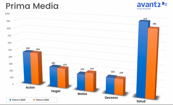 Salud alcanzó una prima media de nueva producción de 902 euros, lo que constituye un descenso interanual de casi un 8%. En cuanto a su evolución intermensual observamos en febrero un decremento del 17%, lo que continúa con la tendencia descendente por tercer mes consecutivo