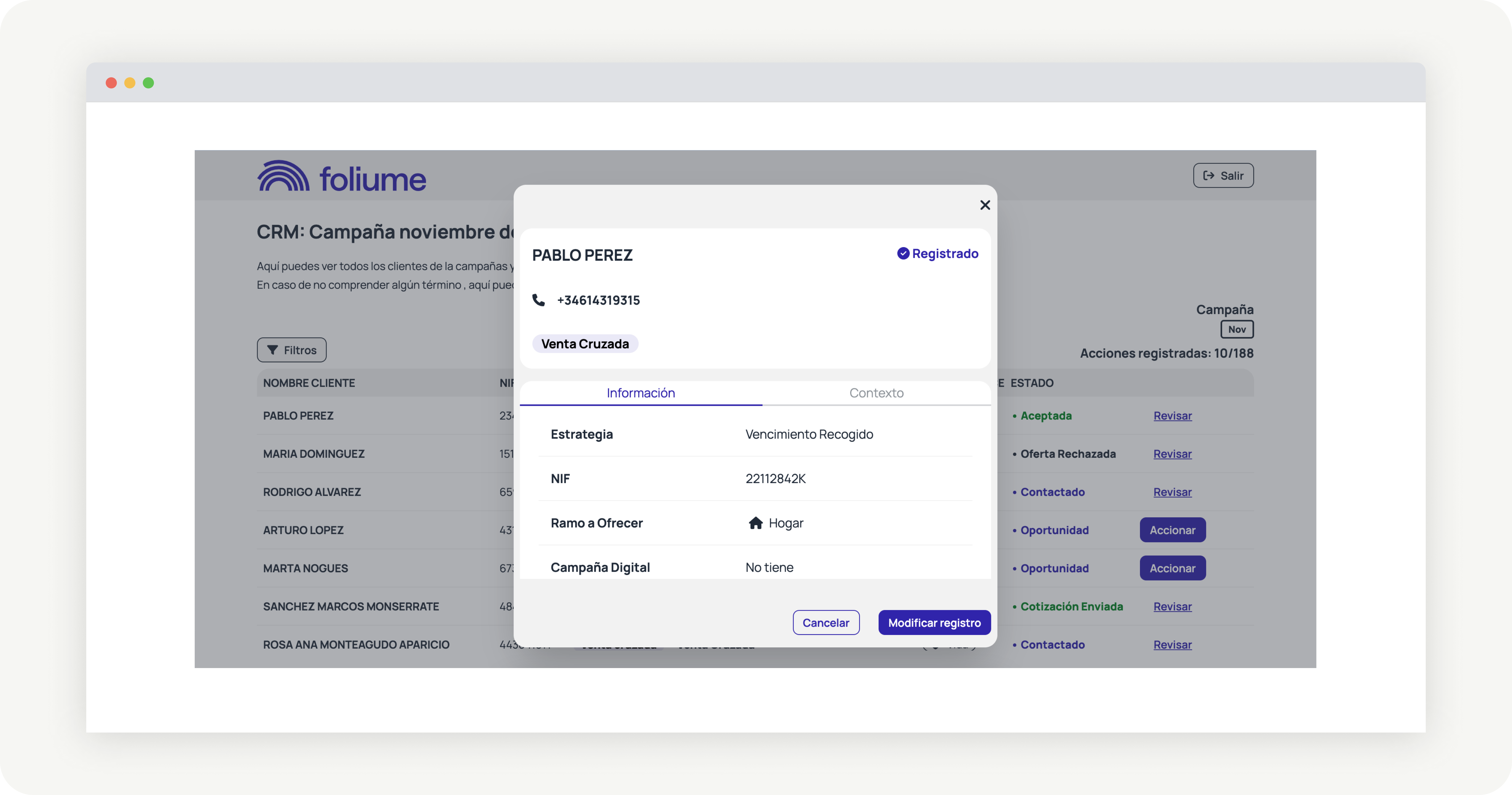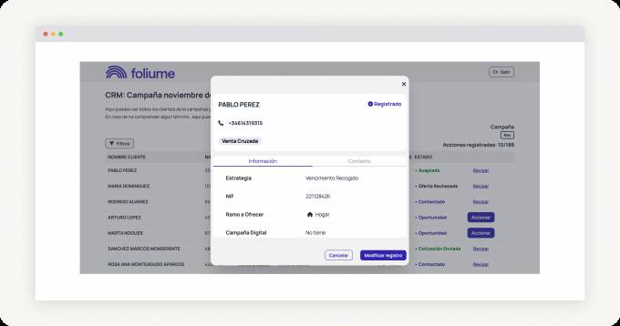 Asimismo, la empresa explica que Foliume 2.0 mantiene su visión de mejorar la productividad de la cartera, pero ahora también apunta a abordar los principales desafíos del día a día del corredor y agente para aumentar el resultado comercial. Así, permite las siguientes funciones: tarificación automática, lanzadera de campañas digitales, IA predictiva de fuga y venta cruzada, y gestión de redes de oficinas/agentes.