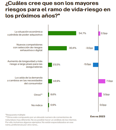 Por otra parte, Aegon ha difundido otros resultados de su 'II Informe del Mediador de Seguros en España', como cuáles son en opinión de los corredores los mayores riesgos para el ramo de Vida Riesgo de cara a los próximos años. El principal riesgo identificado por un 54,7% de la muestra es la situación económica y pérdida de poder adquisitivo, seguido de la entrada de nuevos competidores capaces de hacer una selección de riesgos basada en herramientas digitales (30,4%).