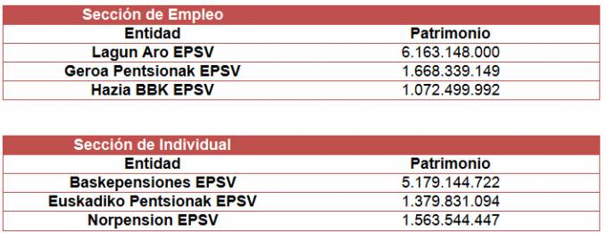 En la modalidad de Empleo, Lagun Aro EPSV lidera el ranking de patrimonio gestionado con 6.163 millones de euros, seguida de Geroa Pentsionak (1.668 millones) y Hazia BBK (1.072 millones).