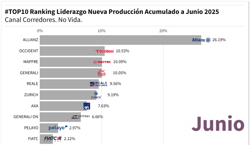 En el acumulado a cierre del semestre, según este análisis, Allianz se mantiene en lo más alto de la clasificación con una cuota de nueva producción de No Vida en el canal de corredores del 26,19%. No obstante, como destacan los autores del análisis, ha perdido casi un 1,5% al final del periodo.