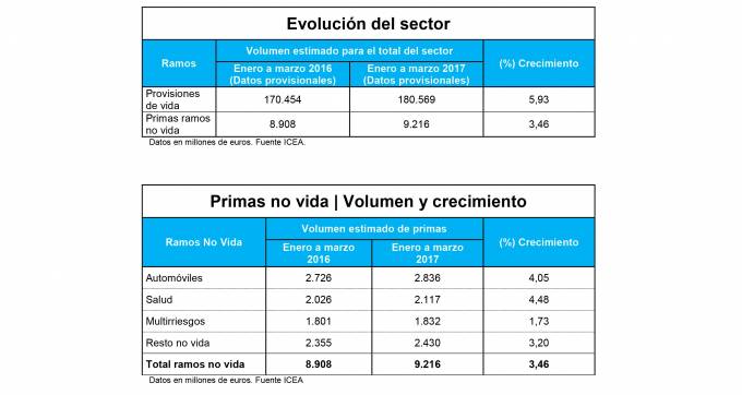 Los ingresos de las aseguradoras en el primer trimestre por la venta de pólizas se elevaron a 18.503 millones de euros, el 11,52% más que en el mismo período del pasado año, según los datos de Unespa recabados por ICEA. La facturación de No Vida fue de 9.216 millones de euros, el 3,46% más.