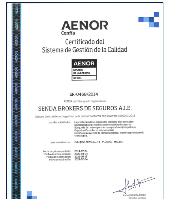 Senda Vivir Seguros renueva su Certificado de Calidad Aenor a través de la cual se certifica que la organización dispone de un sistema de gestión de la calidad conforme con la Norma ISO 9001:2015.
