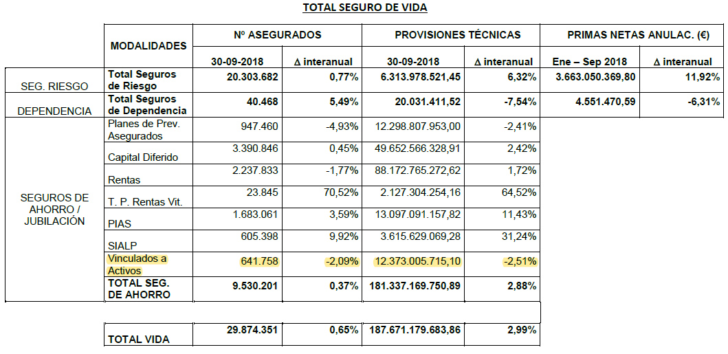 Según los datos de ICEA difundidos por Unespa, estos productos en los que el tomador es el que asume el riesgo, acumulaban a finales de septiembre 12.373 millones de euros en provisiones técnicas, un 2,5% menos que en el mismo periodo del año anterior. No solo desciende, sino que cae más incluso que entre enero y septiembre de 2017, cuando el ahorro gestionado en estos productos se redujo un 1,6%.