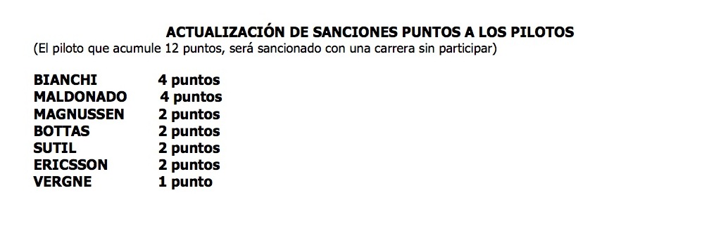 El piloto que acumule 12 puntos, será sancionado con una carrera sin participar...VER