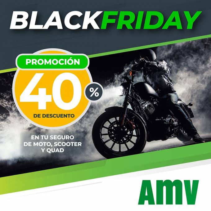 Con motivo del Black Friday la correduría AMV ofrecerá una promoción que incluye un descuento en el seguro de moto del 40% para aquellas pólizas presupuestadas y firmadas desde el 23 de noviembre al 1 de diciembre. El descuento será aplicable en la primera anualidad en las modalidades de Terceros, Terceros Premium, Robo e Incendio y Todo Riego.