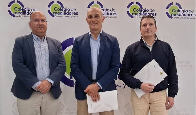 La firma del acuerdo tuvo lugar en la sede del Colegio entre Rafael Cabello, presidente de la institución; Ismael Lozano, miembro de la Comisión de Corredores y Julio Moyano, director de Zona Andalucía Occidental de la aseguradora.