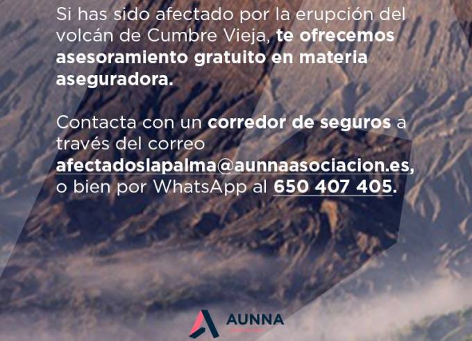 Así, ha habilitado un correo electrónico (afectadoslapalma@aunnaasociacion.es) para que los perjudicados por el volcán se pongan en contacto con un corredor de seguros si lo necesitan. También, Aunna dispone de un teléfono (650 407 405) para interactuar vía WhatsApp.