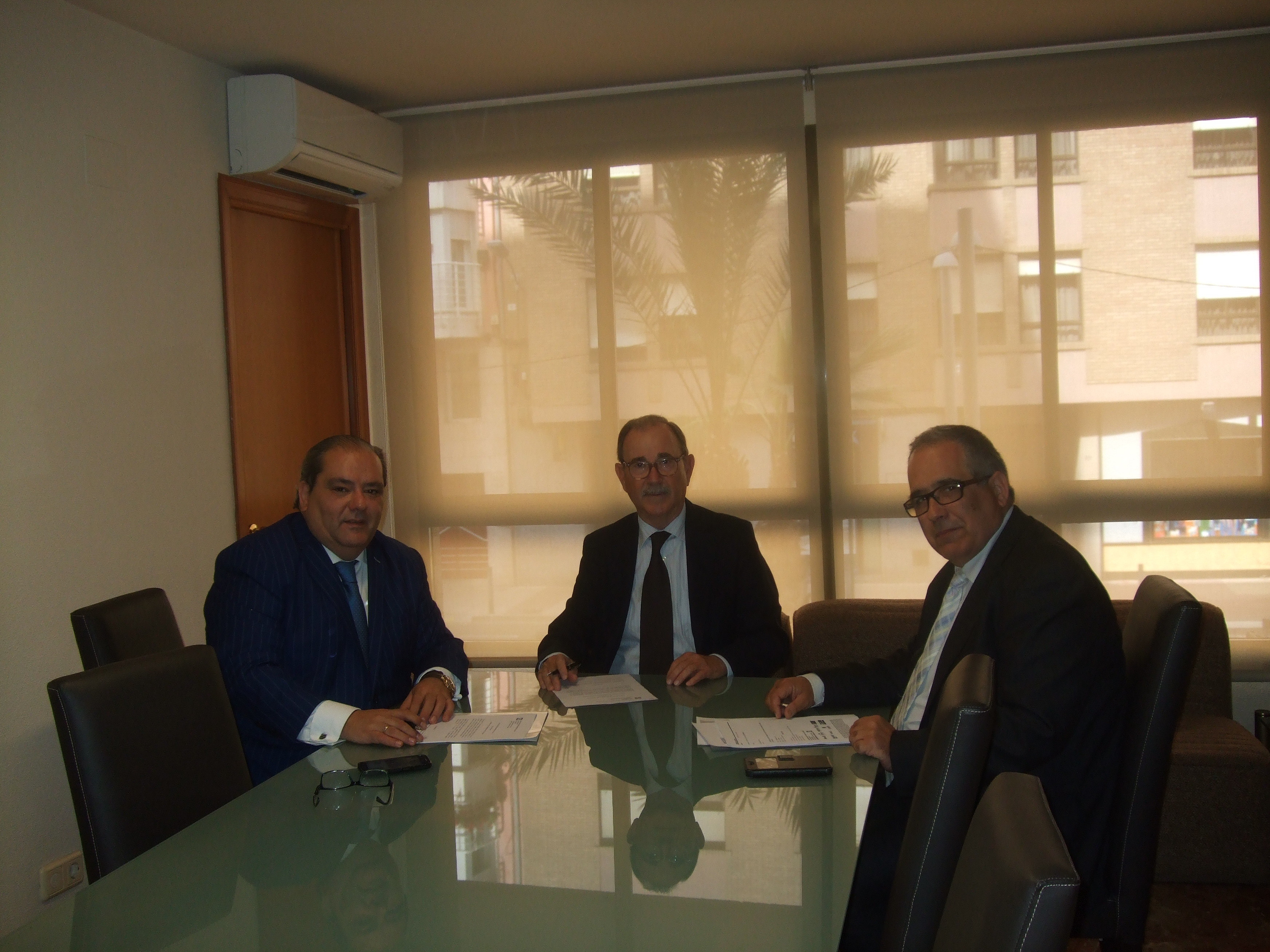 En la firma del acuerdo estuvieron presentes Francisco García, director de la sucursal de Fiatc, y Antonio Fabregat, presidente del Colegio acompañado por Fernando Solsona, secretario de la institución.