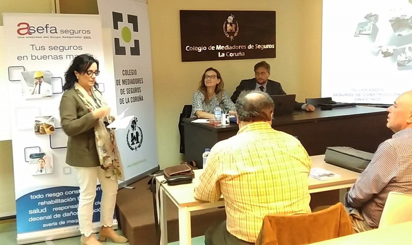 Asefa, entidad colaboradora del Colegio de La Coruña, celebró una jornada formativa sobre construcción en la que participaron Isabel de Jorge Aguinaga, directora de la Delegación Norte, y Daniel Agut Verburg, director técnico de la aseguradora, acompañados por el responsable Comercial de Zona de la Territorial de A Coruña José Antonio Bocelo.