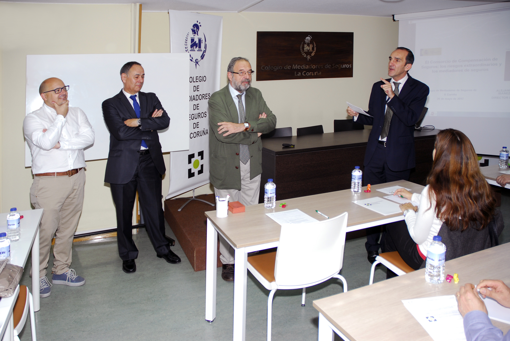 El 26 de mayo, el Colegio de Mediadores de La Coruña acogió a una treintena de profesionales en su aula de formación que asistieron a la jornada formativa sobre el Consorcio de Compensación de Seguros (CCS). Abrió la jornada el presidente de la institución, Juan Manuel Sanchez-Albornoz, que agradeció la presencia del Consorcio en el colegio, esperando "que éste sea el inicio de una colaboración profesional beneficiosa para la mediación". El director de Operaciones del Consorcio, Alejandro Izuzquiza, habló sobre riesgos extraordinarios y mediadores. El responsable de la Subdirección de Tasaciones, Pablo José López, explicó los criterios técnicos aplicables en la peritación de daños e indemnizaciones de riesgos extraordinarios. La jornada concluyó con un turno de preguntas tras la exposición del delegado territorial del Consorcio, Antonio González, sobre la tramitación de los riesgos extraordinarios en Galicia.