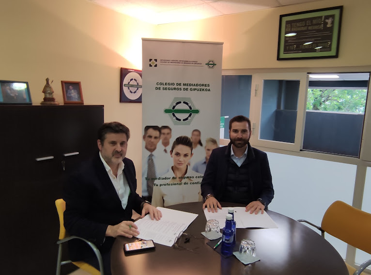 El  presidente del Colegio, Xabier Saizar, y  Víctor Cruzado, director de la Sucursal de San Sebastián firmaron el acuerdo y aprovecharon también la ocasión para hacer balance de la época pandémica en la que estamos inmersos y analizar el impacto que ha tenido en la mediación.