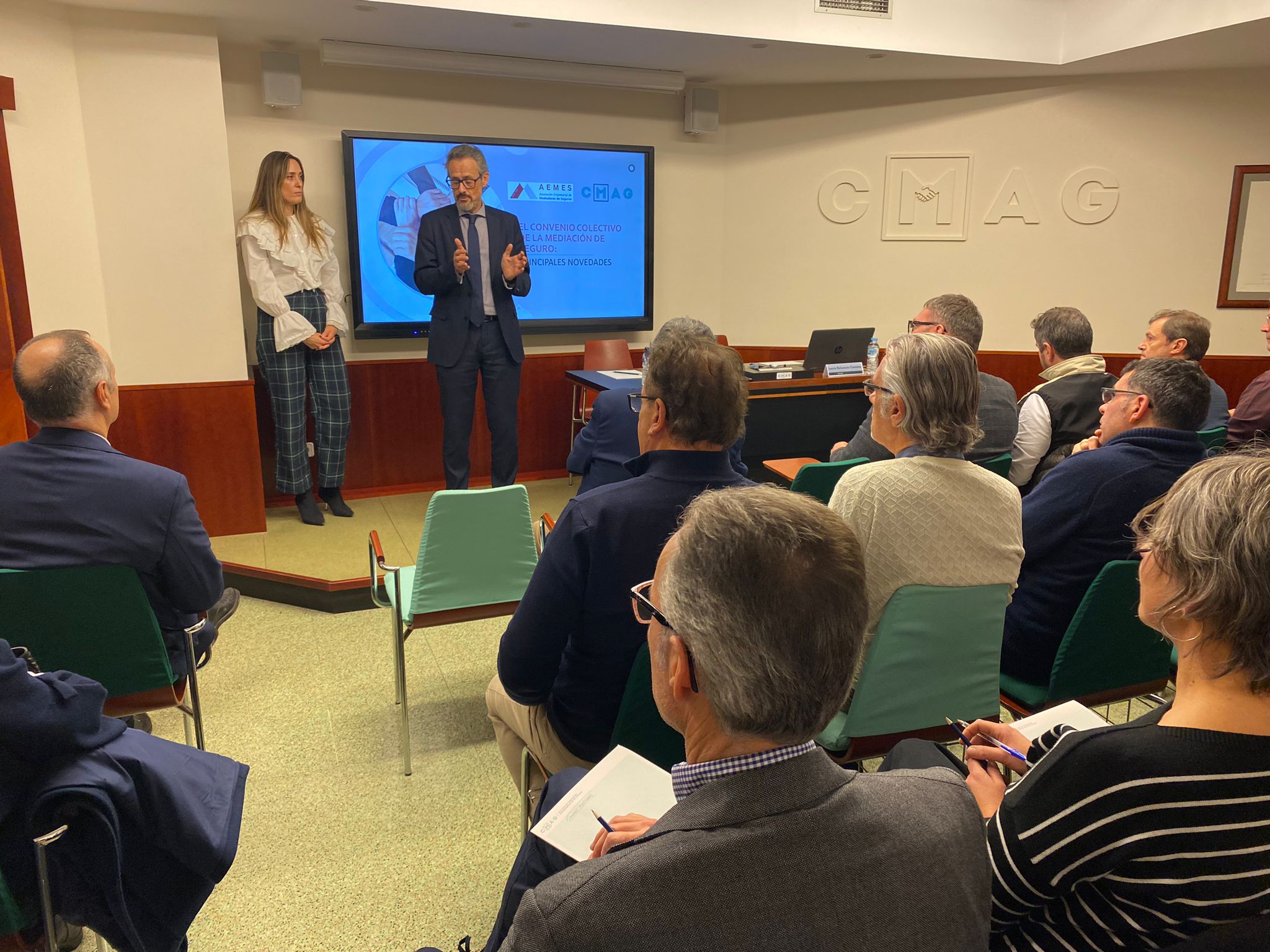 El Colegio de Mediadores de Girona y Aemes han participado en una jornada sobre el nuevo Convenio Colectivo de la Mediación para el periodo 2023-2026 que fue aprobado recientemente. Al acto acudió Jorge Benítez, presidente de Aemes, acompañado por Lucía Relanzón, asesora jurídica y laboral de la asociación.