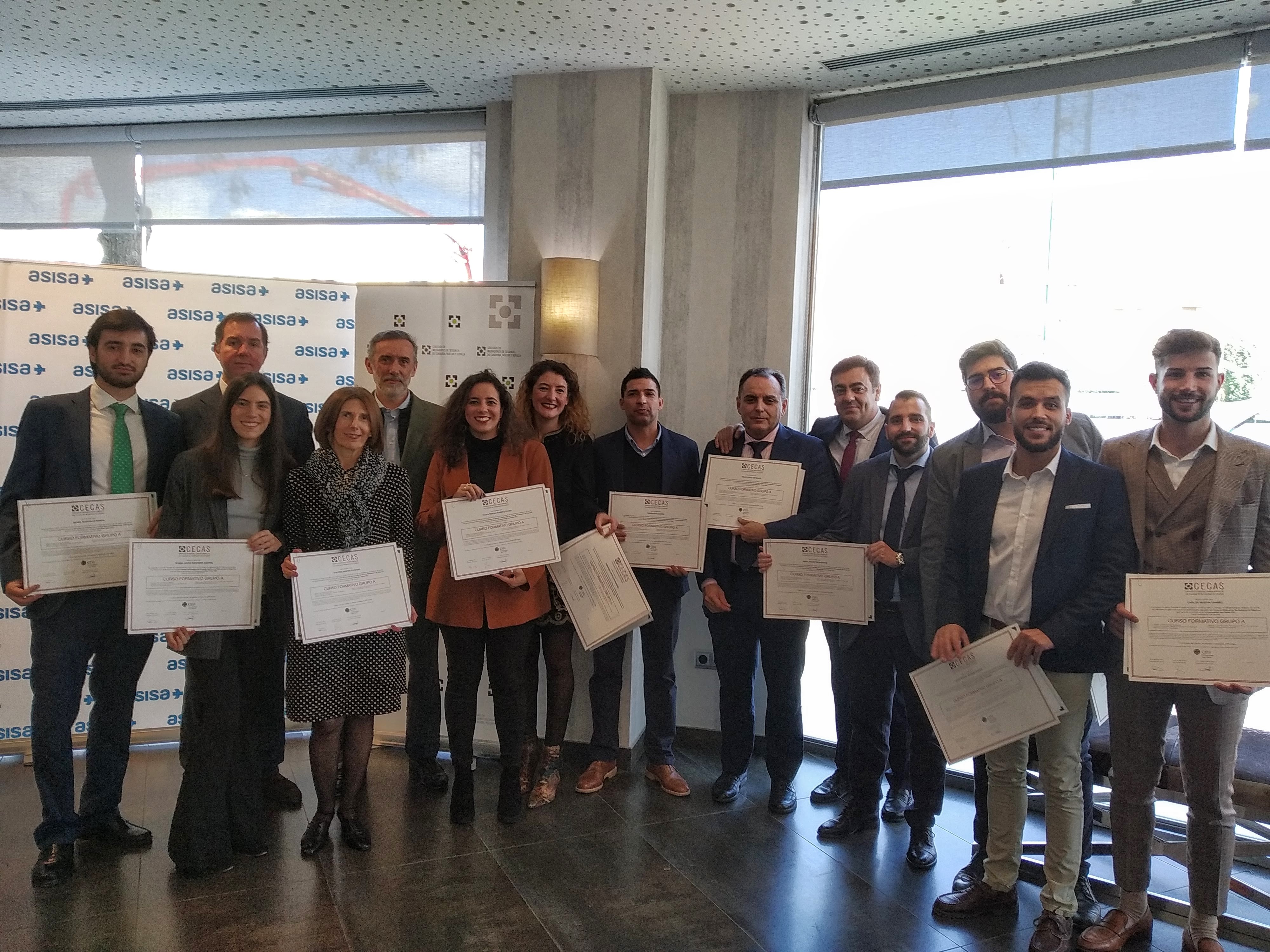 Los alumnos del Curso Superior de Seguros Grupo A 2018-2019, organizado por los Colegios de Córdoba, Huelva y Sevilla recibieron los diplomas acreditativos y orlas respectivas. La entrega se desarrolló en la comida de Navidad celebrada por la institución junto a las compañías patrocinadoras, los miembros de las Juntas de Gobierno, el personal de los colegios y los propios alumnos. También se entregó la Beca Asisa al alumno con mejor expediente, que resultó Javier Duárez.