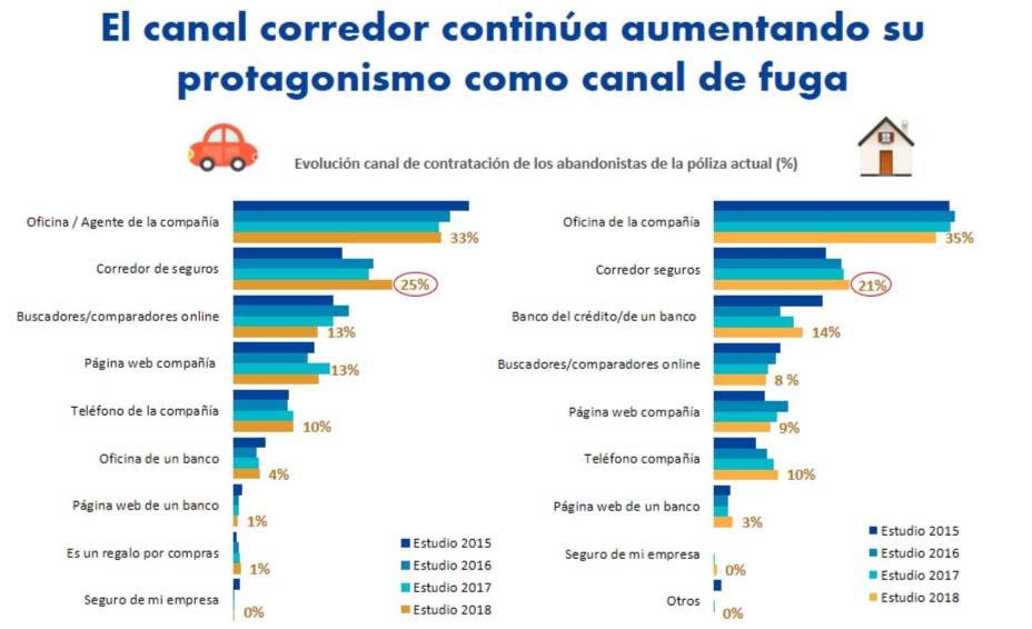 En el capítulo de Hogar, en las oficinas de los agentes finalizan el 35% de los que deciden cambiar de seguro, mientras que en las corredurías lo hacen el 21%. Aquí, el 14% vuelve a suscribir una póliza con un banco, con un importante descenso frente a los datos de 2015.