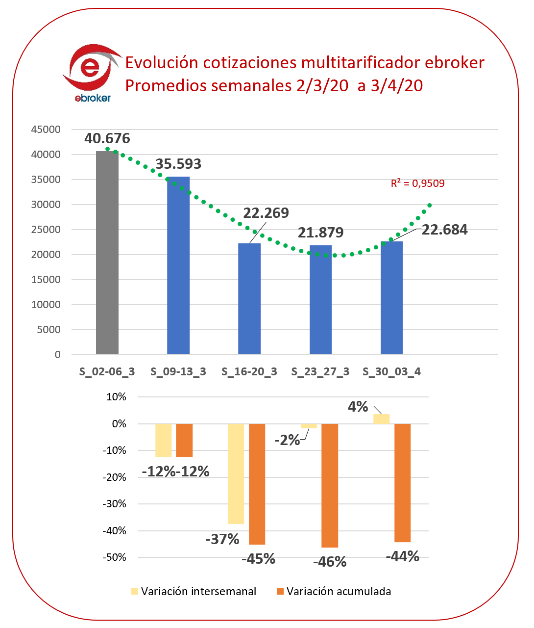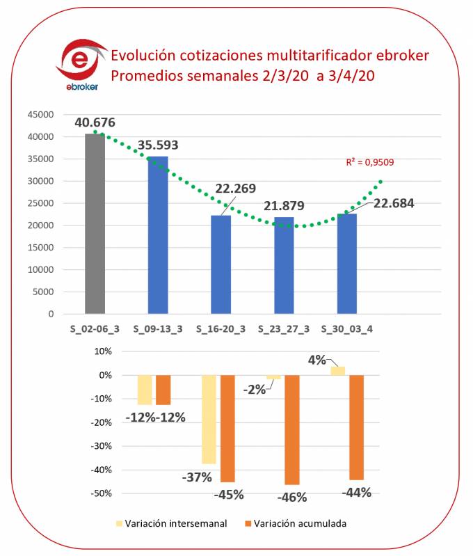 En primer lugar, ha tomado el pulso a la actividad comercial, observando que las cotizaciones de multitarificación han experimentado un retroceso progresivo hasta alcanzar el -46%, en comparación con la primera semana de marzo, previa a la crisis. No obstante, y como noticia positiva, ebroker aprecia una tendencia a la recuperación en estos primeros días de abril, con un crecimiento próximo al 5%.