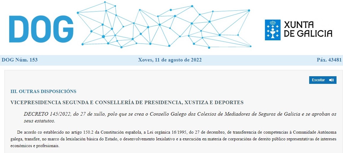 El 11 de agosto será recordado como una fecha histórica para la mediación de seguros de Galicia. Ese día, el Diario Oficial de la región (DOG) publicó el Decreto 145/2022, de 27 de julio, por el que se crea así el Consejo Gallego de los Colegios de Mediadores de Seguros de Galicia y se aprueban sus estatutos.