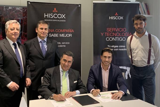 En la firma del acuerdo estuvieron presentes Miguel Ángel Aguilar, director de Nuevo Negocio y Suscripción de Hiscox, y Javier García-Bernal y Roberto Puente, presidente y vicepresidente primero de Apromes.