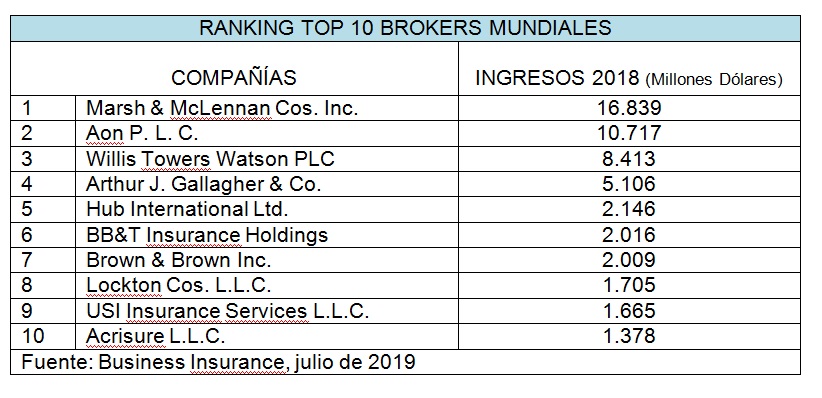 Los 10 primeros brókers del mundo incrementaron sus ingresos un 11,75% en 2018 hasta los casi 52 mil millones de dólares. El Grupo Marsh & McLennan Companies encabeza el crecimiento con un 20% y 16.839 millones de dólares en facturación, ocupando así el primer lugar entre los brókers mayores del mundo según el ránking publicado por la revista Business Insurance.