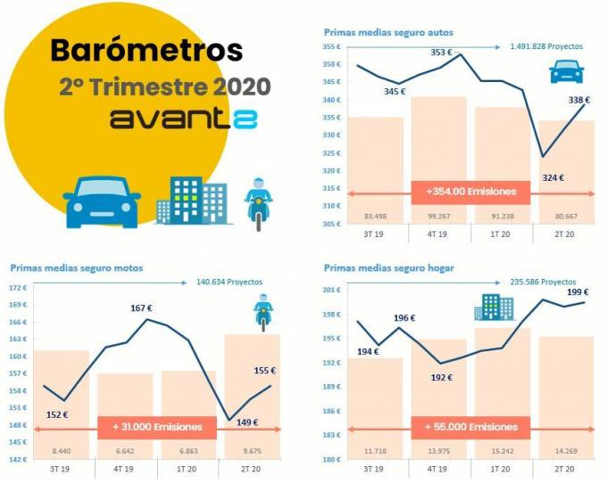 Por último, el seguro de Motos creció mucho en cuanto a producción a lo largo de los tres meses. Tras caer a un mínimo de 1.210 pólizas emitidas en abril, vivió en mayo y junio una recuperación espectacular, impulsada por la estacionalidad del ramo: 4.920 emisiones en junio en Avant2. En cuanto a la prima media de Motos, marcó su punto más bajo en abril al situarse en 149 euros, precio que repuntó en junio hasta los 155 euros. El trimestre se cerró con una prima media de 152 euros, cifra inferior a la de los trimestres precedentes.