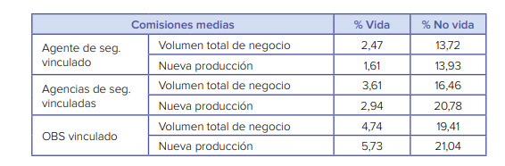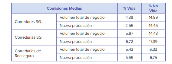 Las comisiones medias de Vida de los corredores se encuentran en el 4,39% para los corredores y 5,97% para las corredurías; en los corredores de reaseguro alcanza el 5,43%. En No Vida, la comisión para el reaseguro está en el 6,33%, mientras que para corredurías se eleva al 14,43% y alcanza el 14,89% para los corredores.