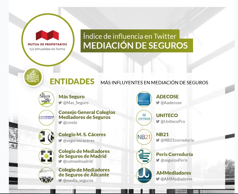 Mutua de Propietarios ha presentado su III Ránking de Influencers de la mediación se seguros en twitter, detallando tanto las organizaciones como las personas físicas. Las cuentas del Colegio de Valencia @Mas_Seguro; el Consejo General, @cmste; el Colegio de Cáceres, @seguroscaceres; el Colegio de Madrid, @colmedmadrid; el Colegio de Alicante @media_seguros; Adecose, @aadecose; Uniteco, @UnitecoPro; NB21, @nb21correduria; Seguros Peris, @segurosPeris y AM Mediadores, @ammediadores son las 10 organizaciones más incluyentes.