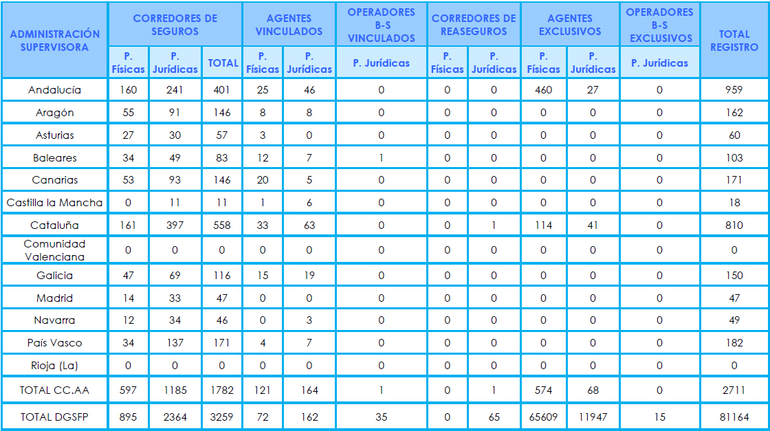 De los 83.875 mediadores registrados, 81.164 están supervisados por la DGSFP y 2.711, por las autoridades autonómicas correspondientes. En relación a este último dato, conviene precisar que falta la información de la Comunidad Valenciana y La Rioja, al igual que en el informe de 2015.