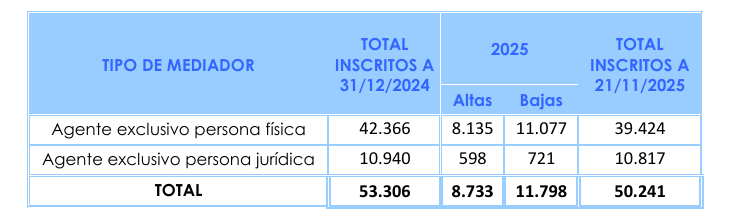 En cuanto al número de agentes, el más numeroso entre la distribución mediada, su número total se eleva hasta los 50.609 en comparación de los 53.697 que marcaban los datos en diciembre de 2024. Así, el retroceso ha sido del 5,7% hasta un total de más de 3.000 profesionales.