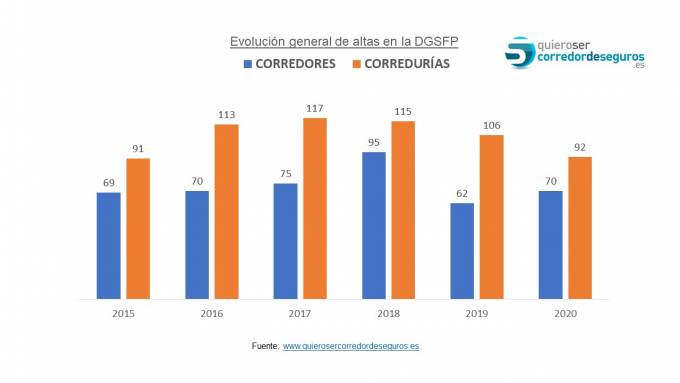 De las 162 altas, 92 corresponden a corredurías (14 menos que en 2019) y 70 a corredores (+8). Desde el portal señalan que ha aumentado, por tanto, la proporción de nuevos corredores individuales frente a las nuevas corredurías. Normalmente, esta proporción suele ser de 1 corredor por cada 3 corredurías.