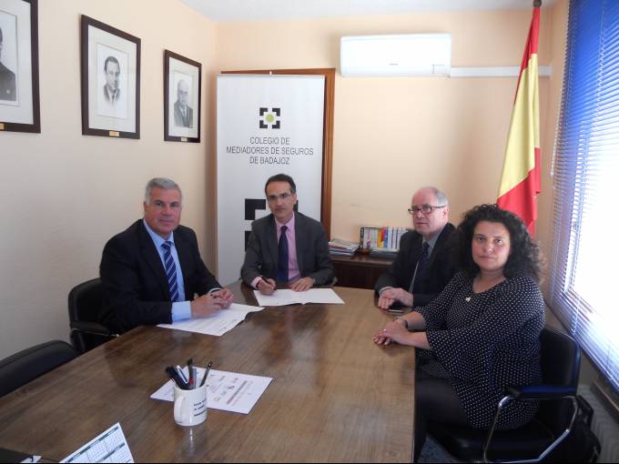 En la firma del protocolo estuvieron presentes Lorenzo Canal, presidente del Colegio; David Gil, director territorial Centro-Sur Corredores de Plus Ultra Seguros; Arturo Viedma, director Zona Andalucía Occidental y Extremadura y la directora de la sucursal de Plus Ultra Seguros en Badajoz, Marta Samperio.