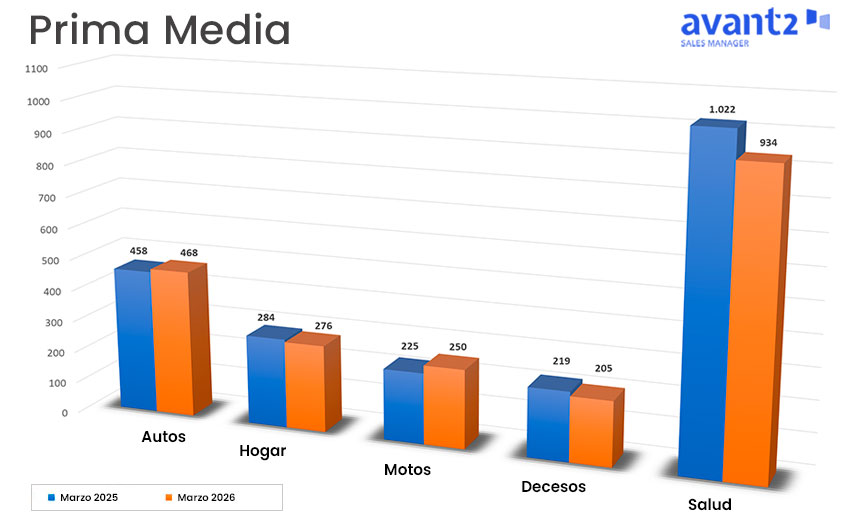 En el ramo de Decesos, la prima media de nueva producción se situó en marzo de este año a los 205 euros, lo que representa un decremento un 6% respecto al mismo mes del año anterior y al mes de febrero de 2026.