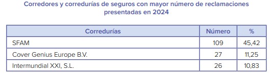 En 2024, las 3 corredurías con mayor número de reclamaciones presentadas ante la DGSFP son: SFAM, que acumuló 109 reclamaciones, lo que supone el 45,42% de todas las presentadas -en 2023 también fue la correduría que aglutinó más quejas-; Cover Genius Europe, con 27 (el 11,25% del total); e Intermundial XXI, con 26 (el 10,83%).