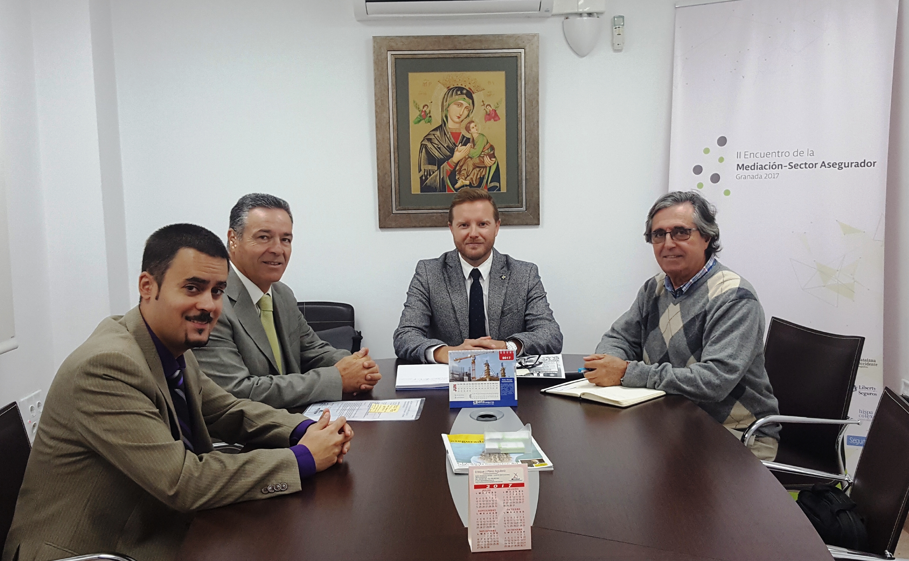 El presidente del Colegio de Granada, Genaro Sánchez, acompañado del vicepresidente de la institución, Enrique J. Pérez, recibieron al director Sucursal de Granada de Preventiva, Rafael Marín y al inspector comercial Jose Antonio Carmona.