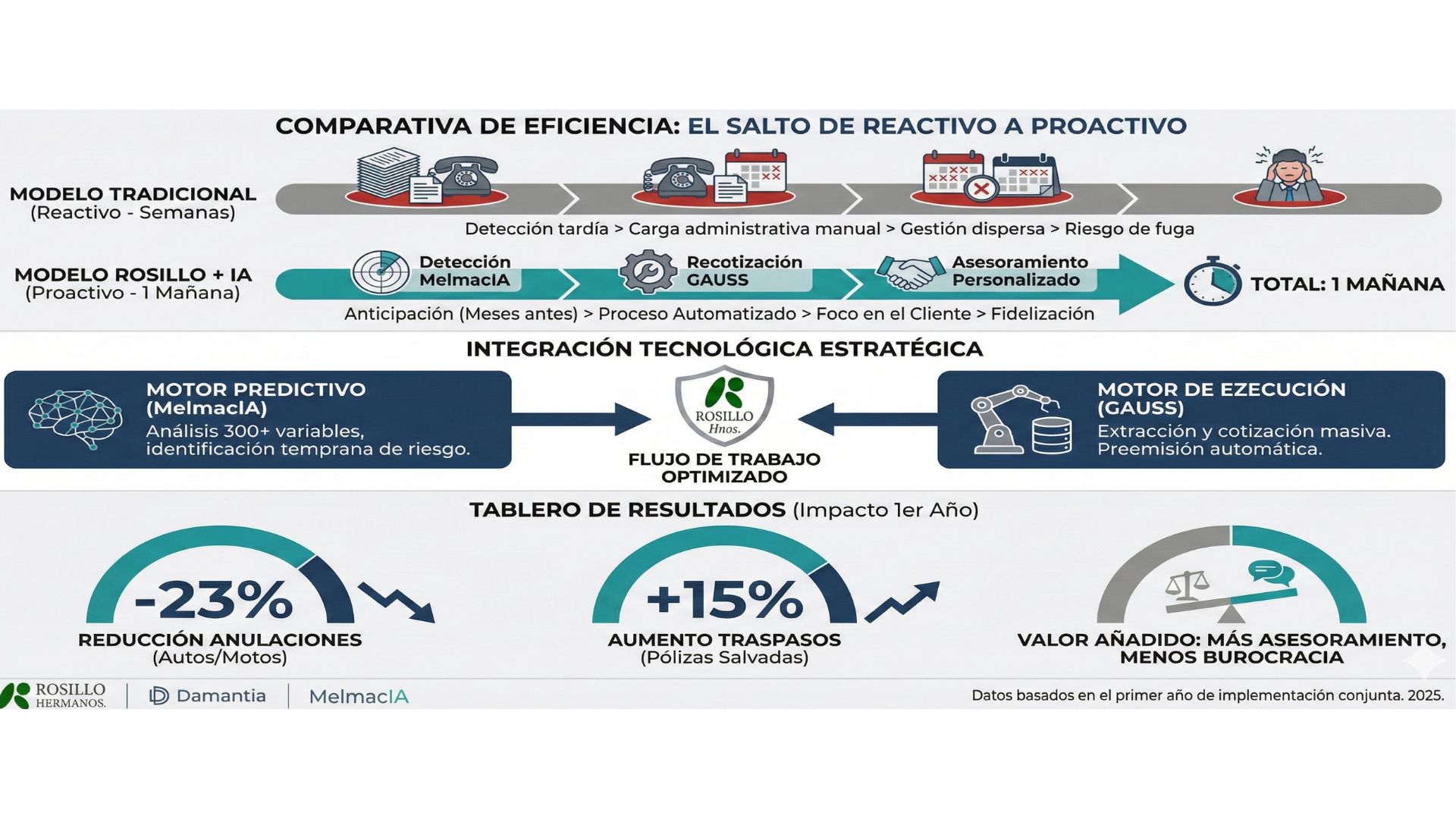 La correduría Rosillo Hnos. ha culminado el primer año de trabajo con la solución conjunta de MelmacIA y Gauss, de Damantia, con una reducción del 23% en anulaciones de Autos y Motos. Además, la entidad resalta que ha logrado reduir la carga de
