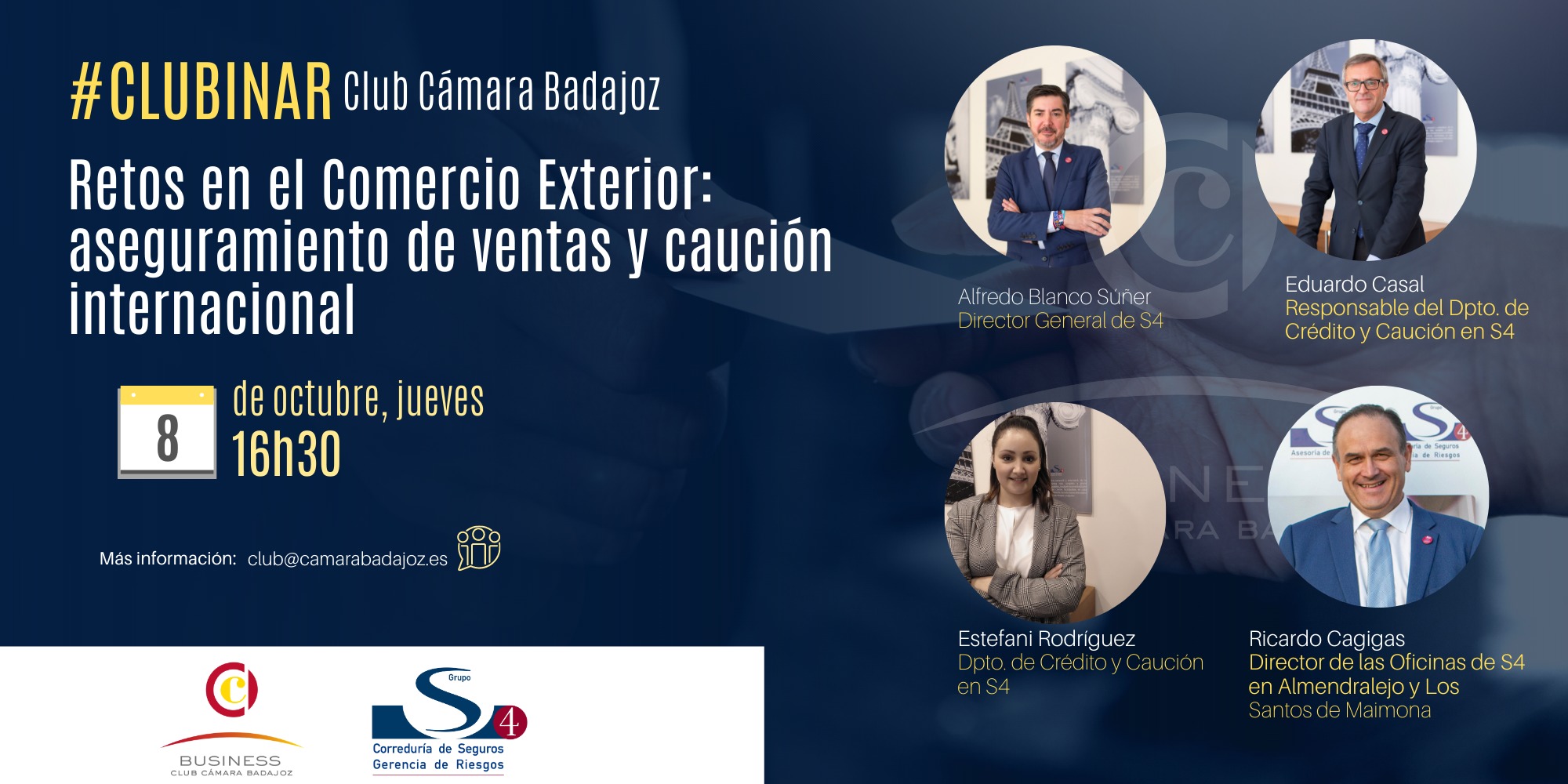 El Grupo S4 ha protagonizado un webinar para hablar sobre los 'Retos en el Comercio Exterior: aseguramiento de ventas y caución internacional' junto a la Cámara de Comercio de Badajoz. El encuentro se dirigió a empresas cuya actividad se desarrolla en más de un país y para detallar las ventajas del seguro de Crédito como herramienta para aumentar la competitividad de las organizaciones.
