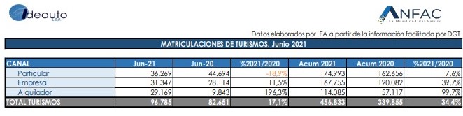 Por canales, el de alquiladores recupera cierto tirón por la mejoría del turismo, pero no consigue superar los registros de 2019, cayendo sus ventas un 29%. La caída en particulares sigue siendo grave, cayendo las ventas tanto en relación con 2019 (-28%) como en 2020 (-19%).
