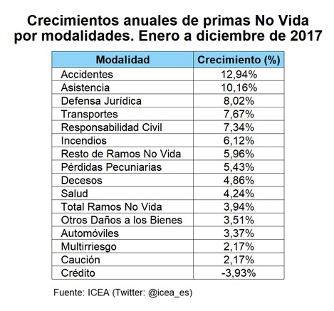 En 2017, las modalidades de seguros de No Vida que más crecieron fueron las de Accidentes, con un alza del 12,94%; y la de Asistencia, con un 10,16%, según los datos de ICEA. El 'Top 5' de los ramos que más crecieron en el último año lo completan Defensa Jurídica (8,02%), Transportes (7,67%) y RC (7,34%).