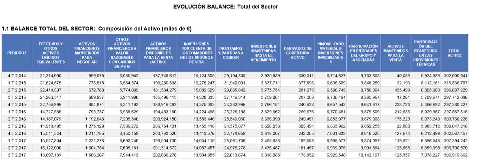 El activo del sector asegurador alcanza 306.919 millones hasta septiembre de 2017
