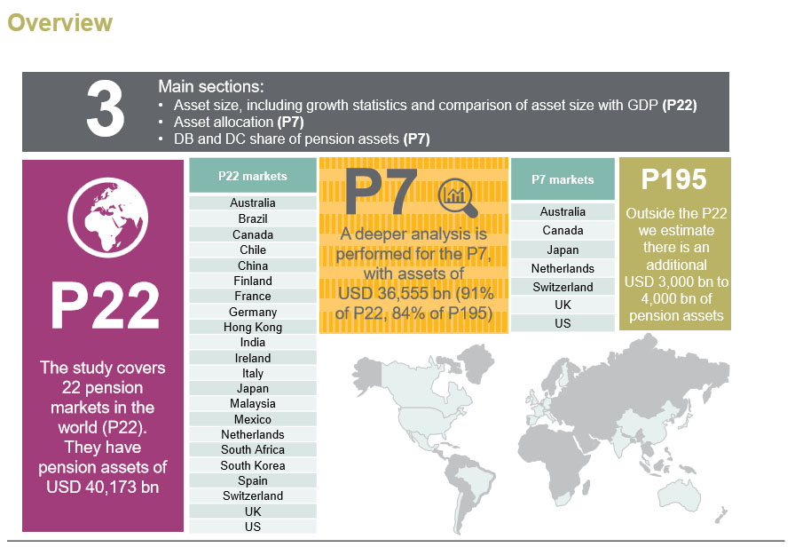 Según el estudio los 7 mercados más grandes lo componen Australia, Canadá, Japón, Países Bajos, Suiza, Reino Unido y Estados Unidos. Estos 7 estados representan el 91% de los activos totales. Estados Unidos sigue siendo el mayor mercado de Pensiones con el 61,5% del total; por detrás se encuentran Japón y Reino Unido con el 7,7% y el 7,1%, respectivamente.
