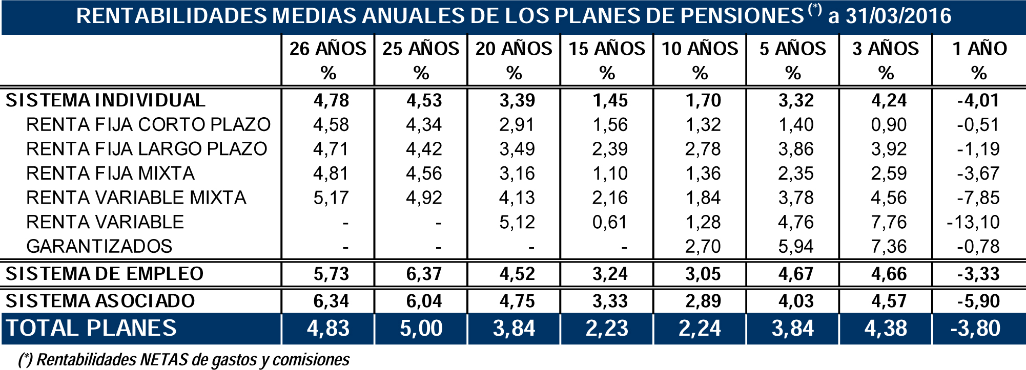 Por sistemas, el patrimonio de los Planes del sistema individual cerró en 67.161 millones, lo que supone un descenso anual del 1%; el número de cuentas de partícipes se situó en 7,84 millones. Los Planes del sistema de empleo cerraron con un volumen de activos de 35.028 millones, con un descenso del 0,8% en el último año; el número de cuentas de partícipes totalizó 2,04 millones. En el sistema asociado, el volumen de activos concluyó en 922 millones, lo que supone una reducción en el último año del 7,6%; el número de cuentas de partícipes fue de 66.729.
