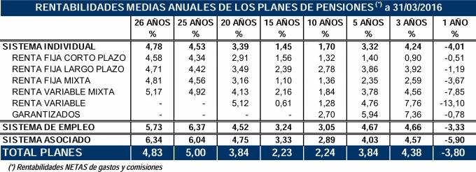 El volumen de activos de los Fondos de Pensiones se situó al cierre de marzo en 103.111 millones de euros, el 1,9% menos que un año antes, tras registrar un descenso de 1.999 millones de euros. Las prestaciones netas en el primer trimestre alcanzaron los 575 millones de euros. El número de cuentas de partícipes se situó en 9.955.280, lo que supone un incremento de 33.629 partícipes respecto a la misma fecha del año anterior. El número de partícipes estimado se sitúa en torno a ocho millones, al existir partícipes con más de un Plan.