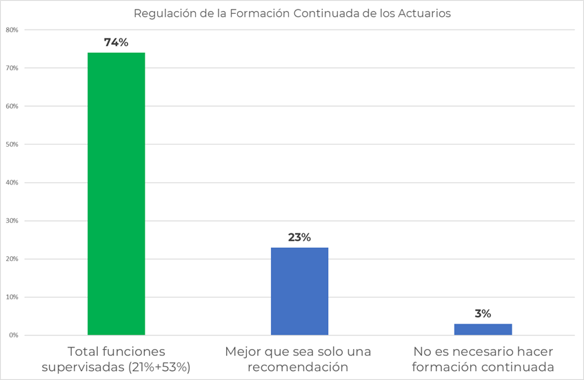 Según una encuesta que ha realizado el Instituto de Actuarios Españoles (IAE), el 53% de los actuarios entrevistados estarían a favor de regular la formación continuada en España como una exigencia legal para toda la profesión. Si bien, un 21% considera que solo debería ser obligatorio para funciones actuariales supervisadas. De esta manera, y sumando las 2 respuestas, el IAE extrae que 3 de cada 4 actuarios estarían a favor de regular la formación continuada en España para los actuarios que realicen las funciones supervisadas. No obstante, un 23% considera que debe seguir siendo únicamente una recomendación y el 3% restante considera que no es necesario acreditar si el profesional se forma o no.