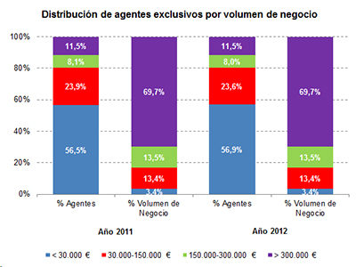 Los datos de ICEA muestran que en 2012 se registró un crecimiento del 0,92% respecto a los códigos operativos en 2011 en aquellas entidades que operan con agentes, con un incremento del 8,36% de las altas. Los datos de la asociación se refieren a una muestra de entidades que representan el 92% de las primas totales de esas entidades que operan con agentes. Los agentes exclusivos más activos, aquellos que generan más de 300.000 euros de volumen de negocio, sólo representan el 11,5% del conjunto de agentes, pero aportan al sector el 69,7% de las primas y cerca de 771.382 euros por agente.